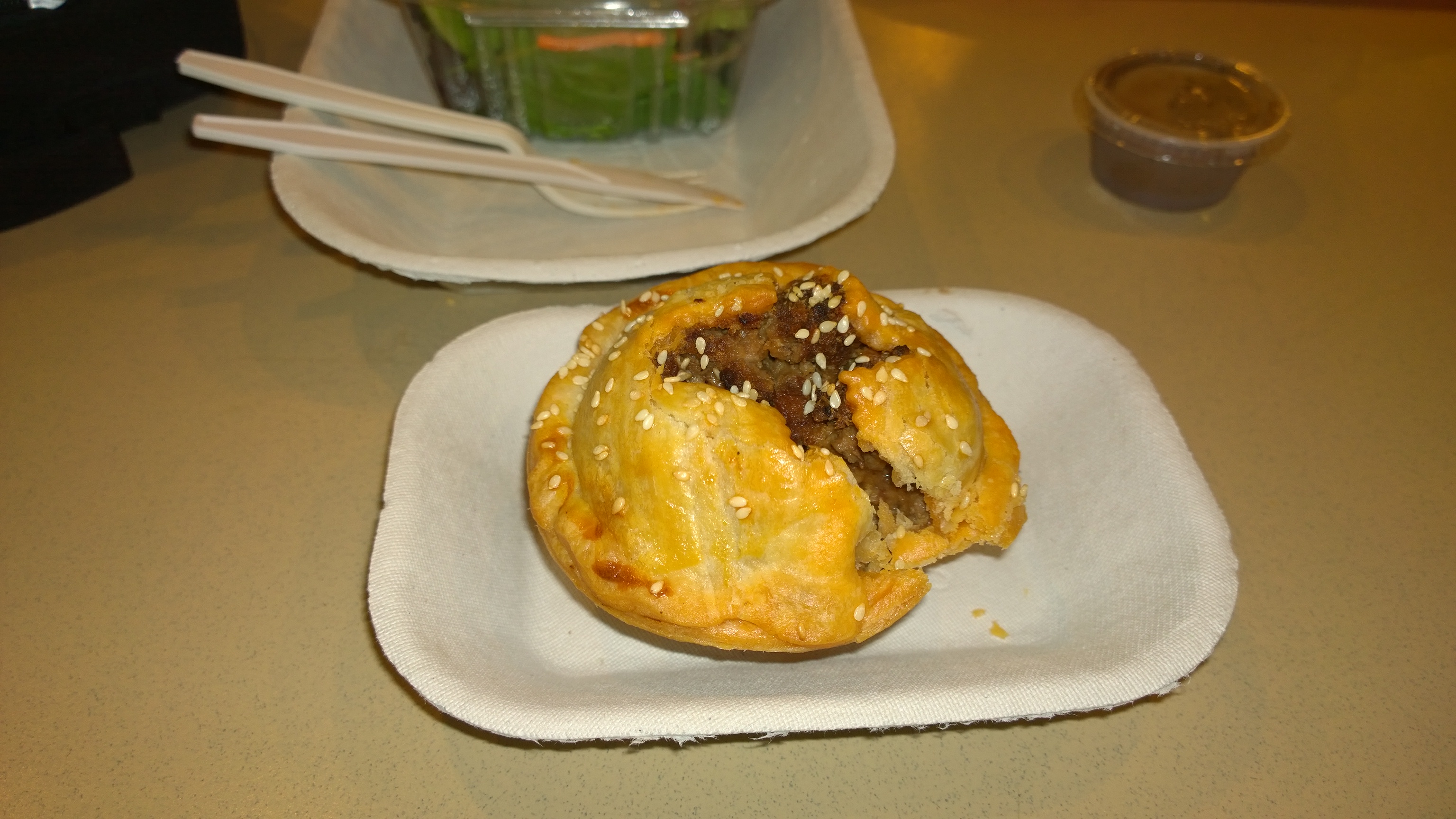 Entering the Armory food court, I found it to be a hub of activity. Apparently, in addition to our own event, there was also some kind of Filipino cultural celebration being held. Skirting the resultant crowds, I scoped out my options and settled on Pies! I figured a savory meat pie would be the closest meal I could come to one that Jamie and Claire likely will eat in MOBY. The Cheeseburger Meat Pie was delicious. (I really wanted the English Meat Pie, but there weren’t any ready when I ordered and besides, I was afraid that would brand me a Sassenach forever.)